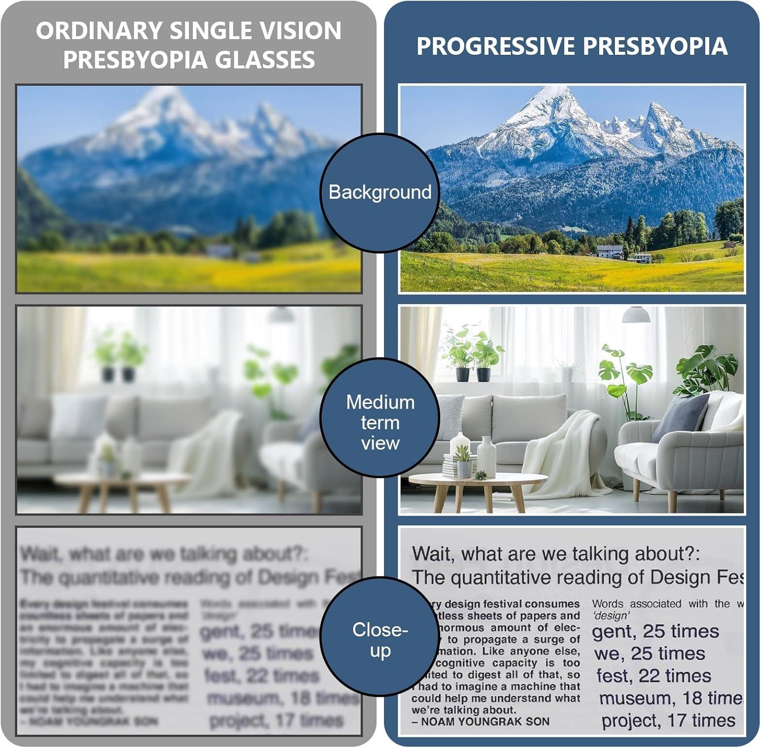 - Smart Progressive Multifocal Reading Glasses:Experience ultimate visual clarity with intelligent progressive multifocal lenses. Combining three prescriptions in one, these multifocal reading glasses allow you to read, use a computer, and interact with others without constantly switching glasses.